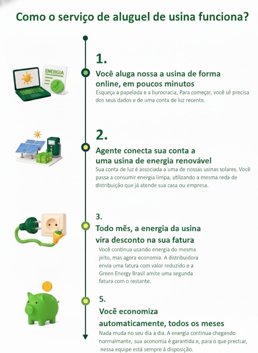 Oferecer soluções de energia limpa, acessível e eficiente, por meio do aluguel de usinas solares, garantindo economia imediata na conta de luz e contribuindo para um futuro mais sustentável.